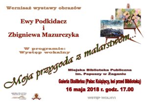 Miejska Biblioteka Publiczna im. Papuszy w Żaganiu zaprasza w środę 16 maja o godz. 17.00 do holu przy bibliotece na wernisaż wystawy obrazów Ewy Podkidacz i Zbigniewa Mazurczyka pod tytułem „Moja przygoda z malarstwem”. W programie występ wokalny. Wstęp wolny.