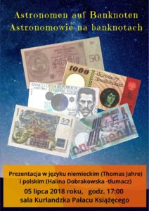 W czwartek 5 lipca o godz. 17:00 zapraszamy do sali Kurlandzkiej Pałacu Książęcego na spotkanie połączone z prezentacją i wystawą zbiorów „Astronomowie na Banknotach”, które poprowadzą Thomas Jahre (prezentacja w języku niemieckim) i Halina Dobrakowska (tłumacz). Pan Thomas jest nauczycielem fizyki i astronomii, zamiłowanym znawcą życia i osiągnięć Johannesa Keplera i nie tylko. Pochodzi z […]