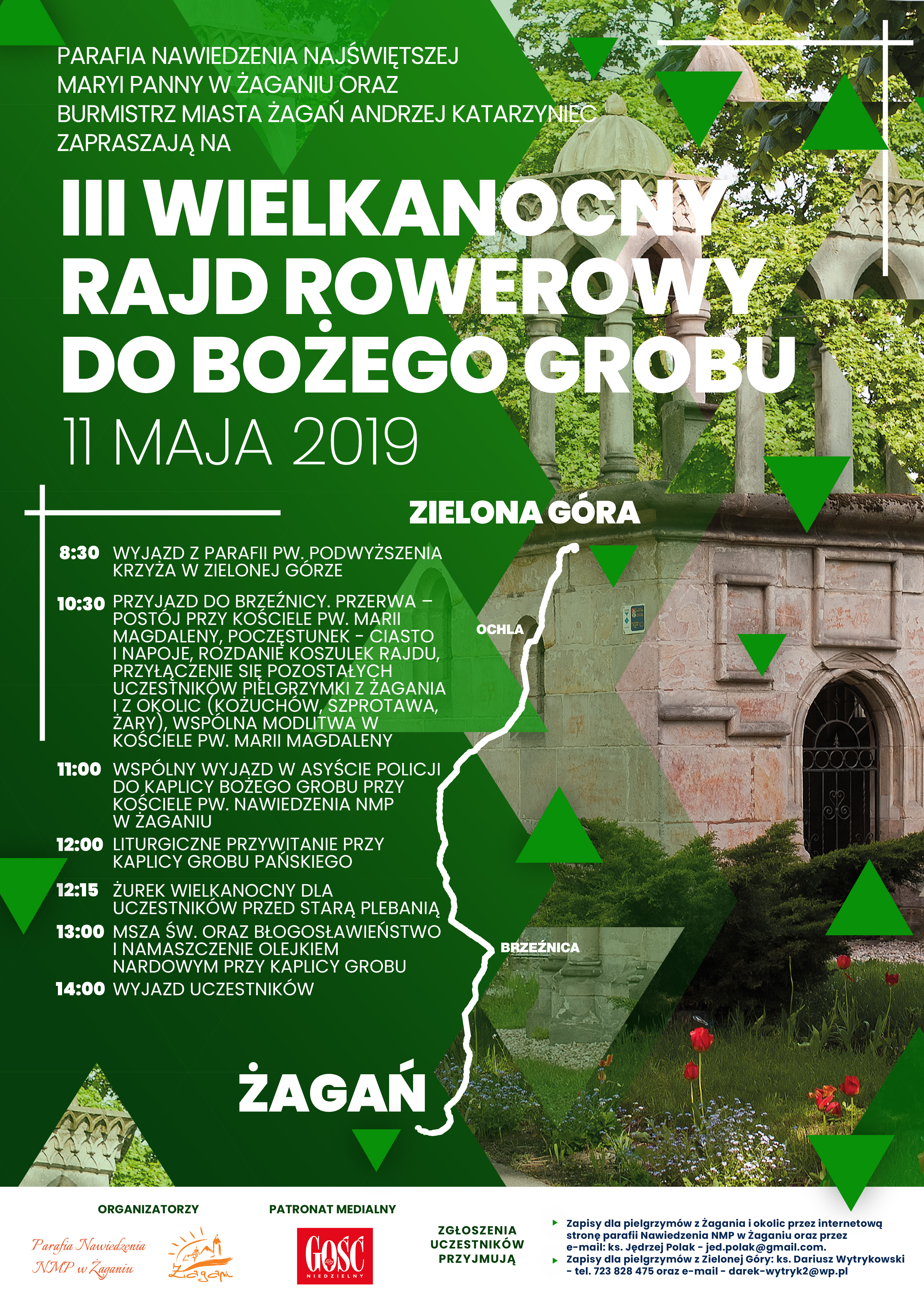 Parafia Nawiedzenia Najświętszej Maryi Panny w Żaganiu zaprasza 11 maja na trzeci Wielkanocny Rajd do Bożego Grobu, który wyruszy o godzinie 8:30 z Zielonej Góry, aby o godzinie 12:00 dotrzeć do Żagania i wziąć udział w liturgicznym powitaniu przy Bożym Grobie.