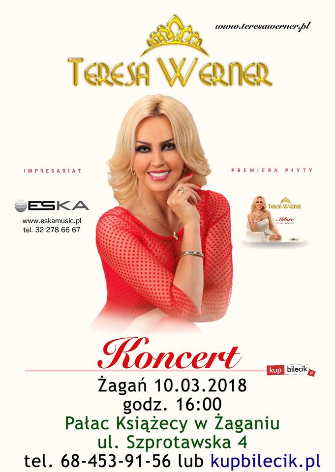 Bilety na koncert Teresy Werner można kupić na www.kupbilecik.pl lub w pokoju nr 270 w Pałacu Książęcym, od poniedziałku do piątku w godz. 7.30-15.30, Zapraszamy!