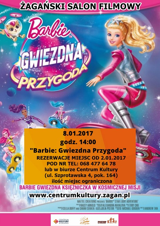 W niedzielę 8 stycznia 2017 roku zapraszamy wszystkie dzieci od lat 3 na seans. W sali Inter Pałacu Książęcego o godzinie 14:00 wyświetlona zostanie bajka „Barbie: Gwiezdna Przygoda”. Wstęp wolny – rezerwacje miejsc od 2 stycznia 2017 roku pod nr tel 068 477 64 78 lub w biurze Centrum Kultury (ul. Szprotawska 4, pok. 164) – ilość miejsc ograniczona.