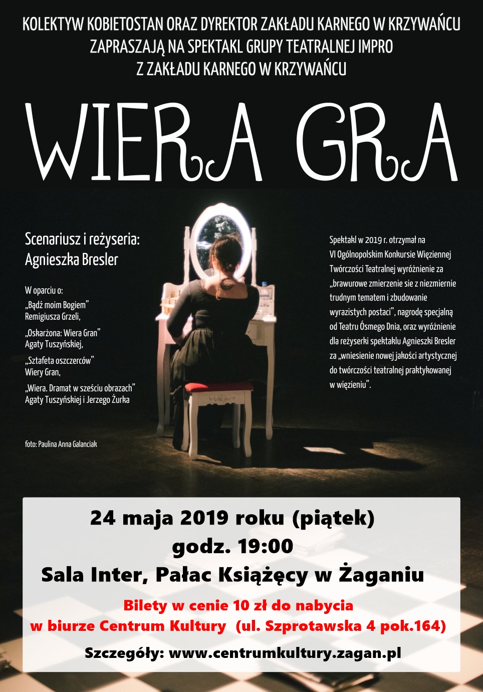 Kolektyw Kobietostan oraz dyrektor Zakładu Karnego w Krzywańcu zapraszają na spektakl pt. „Wiera Gra” grupy teatralnej ,,Impro’’ z Zakładu Karnego w Krzywańcu, który odbędzie się 24 maja o godz. 19:00 w sali Inter Pałacu Książęcego. Bilety do nabycia w cenie 10 zł w biurze Centrum Kultury (ul. Szprotawska 4, pokój 164).