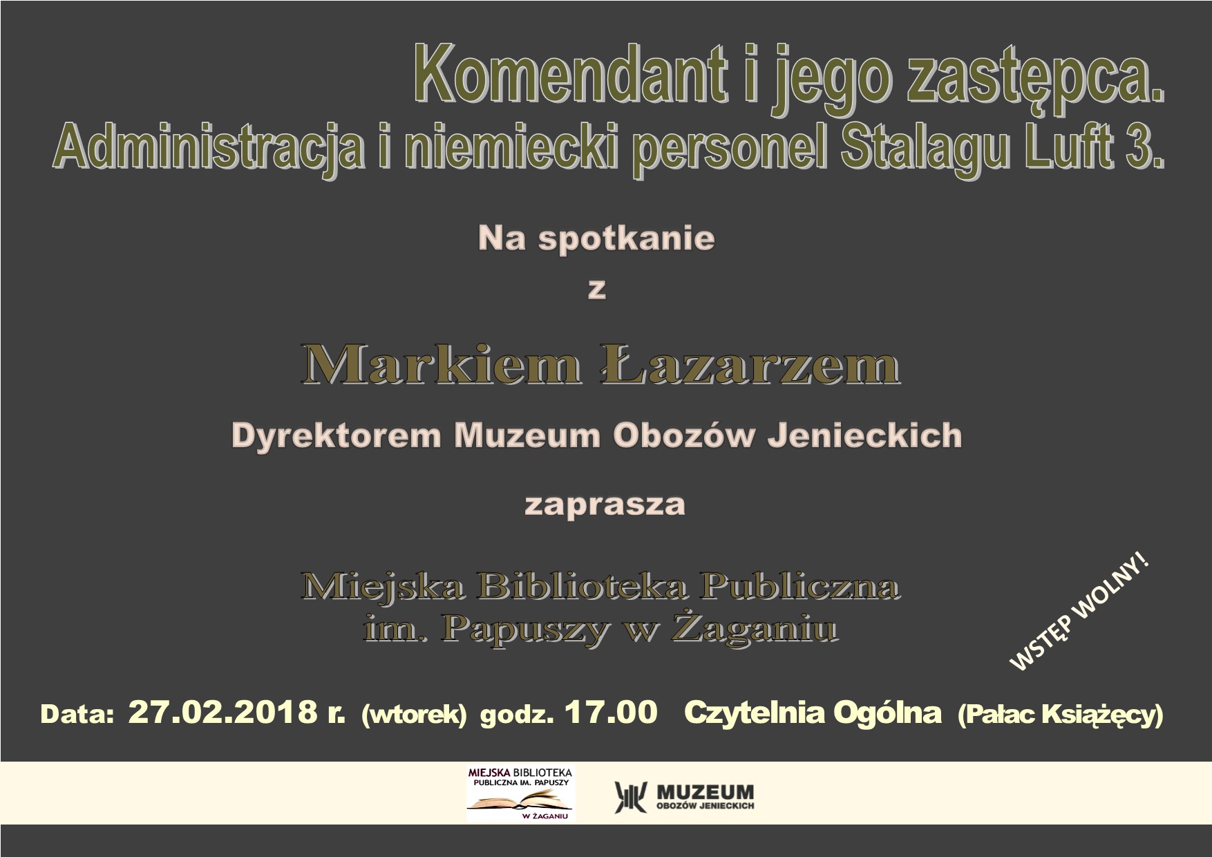 Miejska Biblioteka Publiczna im. Papuszy zaprasza we wtorek 27 lutego o godz. 17.00 do czytelni ogólnej na spotkanie z Markiem Łazarzem, dyrektorem Muzeum Obozów Jenieckich w Żaganiu. Tematem spotkania będzie “Komendant i jego zastępca. Administracja i niemiecki personel Stalagu Luft 3. Wstęp wolny.