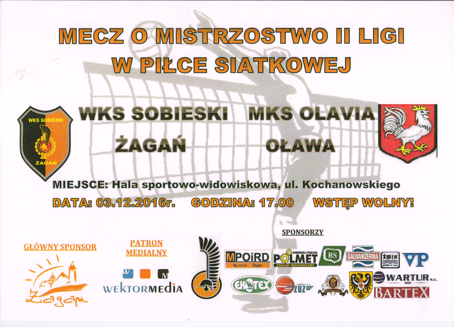 3 grudnia 2016 roku o godzinie 17:00 zapraszamy na kolejny mecz II ligi piłki siatkowej pomiędzy WKS SOBIESKI ŻAGAŃ- MKS Olavia Oława.
