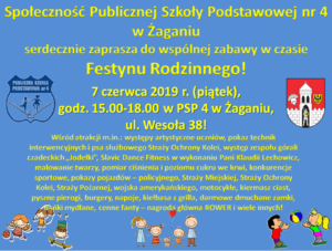 7 czerwca 2019 r. w godz. 15.00-18.00 na terenie Publicznej Szkoły Podstawowej nr 4 w Żaganiu przy ul. Wesołej 38 odbędzie się kolorowy festyn rodzinny. W programie m.in.: - pokaz wozów różnych rodzajów służb mundurowych - policji, straży pożarnej, pogotowia, straży miejskiej, straży ochrony kolei, wojska amerykańskiego, - loteria fantowa - do zdobycia cenne fanty, […]