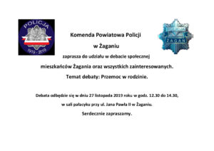 Komenda Powiatowa Policji w Żaganiu zaprasza do udziału w debacie społecznej  mieszkańców Żagania oraz wszystkich zainteresowanych. Debata odbędzie się w dniu 27 listopada 2019 roku w godz. 12.30 do 14.30, w sali pałacyku przy ul. Jana Pawła II w Żaganiu. Temat debaty: Przemoc w rodzinie Serdecznie zapraszamy.
