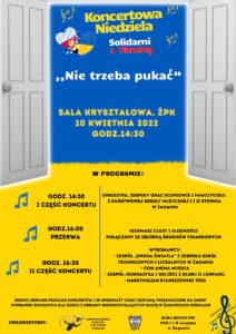 Uczniowie i grono pedagogiczne Państwowej Szkoły Muzycznej I i II stopnia w Żaganiu zaprasza na Koncertową Niedzielę. 10 kwietnia w Żagańskim Pałacu Kultury na sali Kryształowej od godziny 14.30 rozbrzmi muzyka. Koncert to chęć wyrażenia naszej solidarności z Ukrainą, ale również podzielenie się tym co dla nas tak cenne … MUZYKĄ!