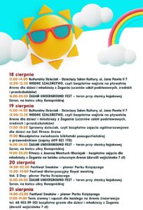 Zapraszamy wszystkich mieszkańców na 11.00-14.00 Kulturalny Dzieciak – Dziecięcy Salon Kultury, ul. Jana Pawła II 7 (więcej informacji pod nr tel. 602721395) 12.00-13.30 WODNE SZALEŃSTWO, czyli bezpłatne wejście na pływalnię Arena dla dzieci i młodzieży z Żagania (uczniów szkół podstawowych, średnich i przedszkolaków), limit wejść - 40 osób 16.00-24.00 ŻAGAŃ UNDERGROUND FEST – teren przy […]