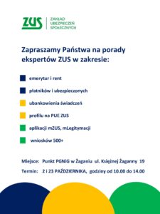 Na zaproszenie burmistrza Andrzeja Katarzyńca kolejny raz w Żaganiu swoje dyżury potwierdzili eksperci ZUS. Zapraszamy 23 października do punktu utworzonego w centrum przesiadkowym przy ulicy Żaganny 19 na dyżur, który odbędzie się między godziną 10.00 a 14.00.