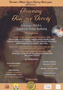 We wtorek 6 lutego 2024 roku w Żagańskim Pałacu Kultury świętować będziemy "Imieniny Księżnej Doroty". W programie: godz. 17.00 Spotkanie autorskie z Jarosławem Skorulskim (Fundacja "Ogrody Kultury" im. księżnej Dino) - promocja książki: Dorota de Talleyrand-Perigord. Wspomnienia z podróży 1852-1853 (SALA KRYSZTAŁOWA) godz. 18.00 Degustacja wina "Duchesse de Dino" z żagańskiej Winnicy Saganum godz. 18.30 […]