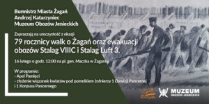 Zapraszamy na uroczystość z okazji 79 rocznicy walk o Żagań oraz ewakuacji obozów Stalag VIIIC i Stalag Luft 3. 16 lutego o godz. 12:00 na pl. gen. Maczka w Żaganiu. W programie: - Apel Pamięci, - złożenie wiązanek kwiatów pod pomnikiem żołnierzy 1 Dywizji Pancernej i 1 Korpusu Pancernego.