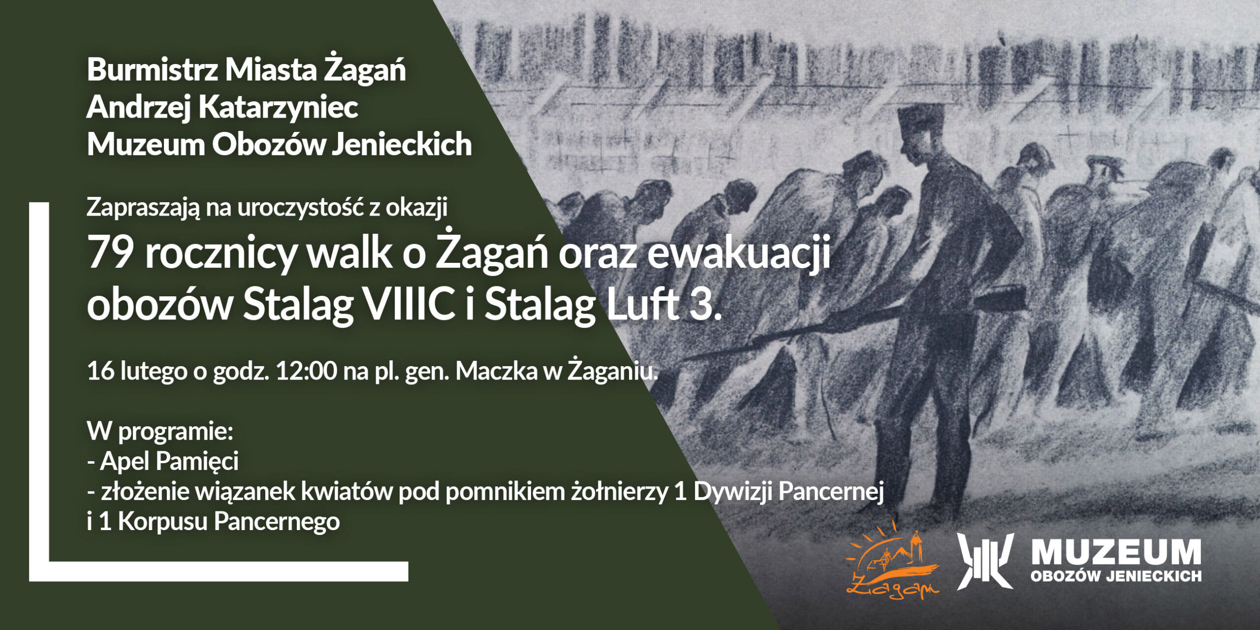 Zapraszamy na uroczystość z okazji 79 rocznicy walk o Żagań oraz ewakuacji obozów Stalag VIIIC i Stalag Luft 3. 16 lutego o godz. 12:00 na pl. gen. Maczka w Żaganiu.