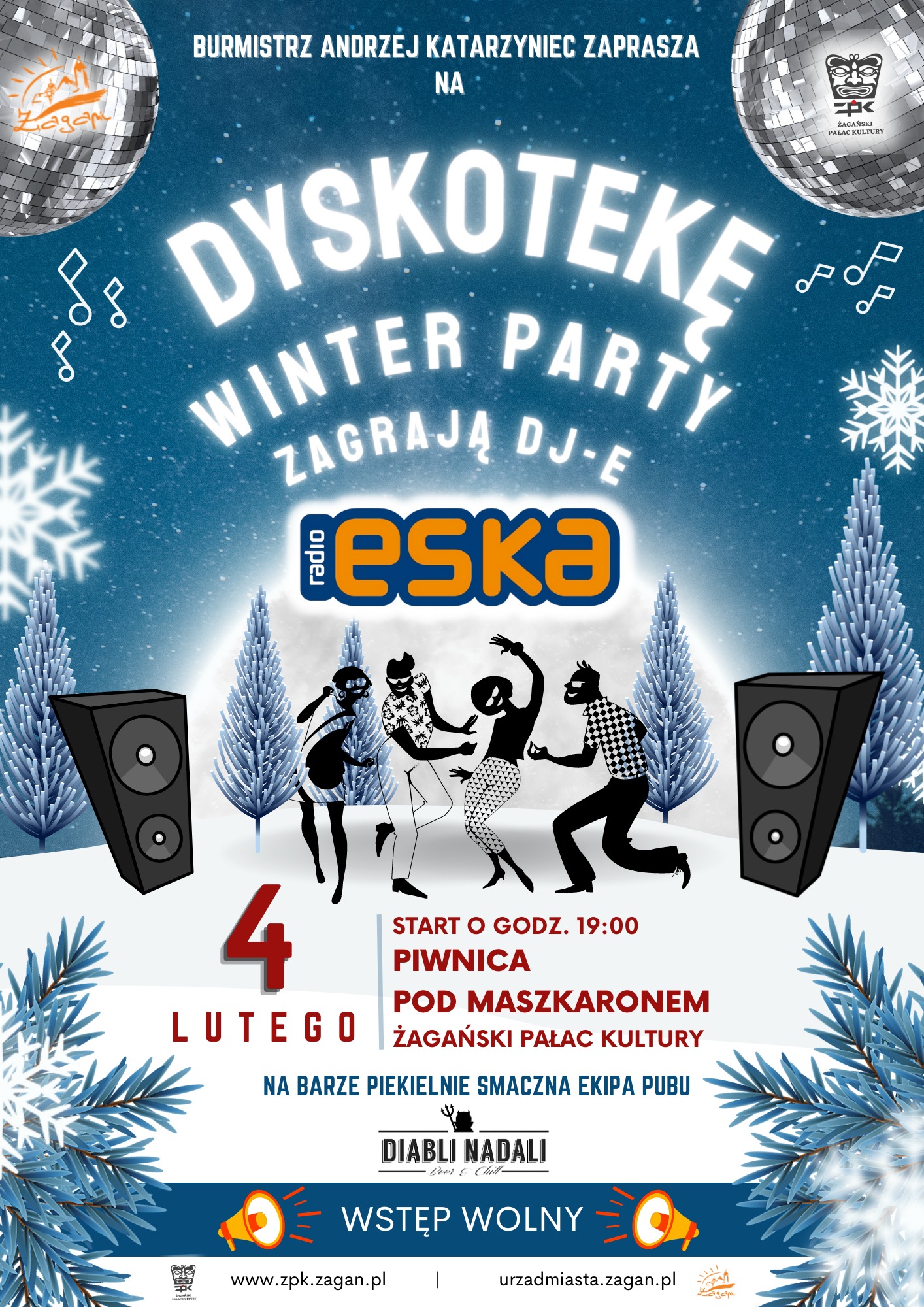 Wieczorem zapraszamy młodzież na dyskotekę ,,Winter Party” z Radio Eska! Imprezę zagrają antenowi dje z RADIO ESKA – Zielona Góra (Filip Kurzyński & Maciej Juszczak). Na barze piekielnie smaczna ekipa baru ,,Diabli Nadali”. Dobra atmosfera, największe przeboje gwarantowane! Wstęp wolny!