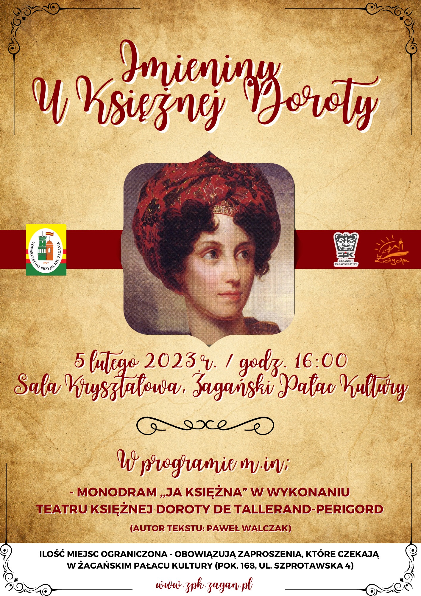 5 lutego o godzinie 16:00 w sali Kryształowej pałacu będziemy świętować “Imieniny Księżnej Doroty”. W programie m.in. monodramat “Ja Księżna” w wykonaniu TEATRU KSIĘŻNEJ DOROTY De Tallerand-Perigord (autor tekstu: Paweł Walczak). Wstęp wolny – ilość miejsc ograniczona. Obowiązują zaproszenia, które czekają w pok. nr 168 w ŻPK (ul. Szprotawska 4).