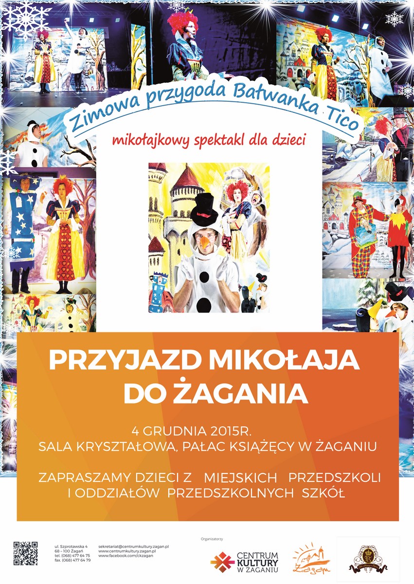 4 grudnia (piątek) zapraszamy dzieci z żagańskich przedszkoli oraz oddziałów przedszkolnych szkół do sali Kryształowej Pałacu Książęcego na spotkanie z Mikołajem. Ponadto będzie można przeżyć zimową przygodę z bałwankiem Tico.