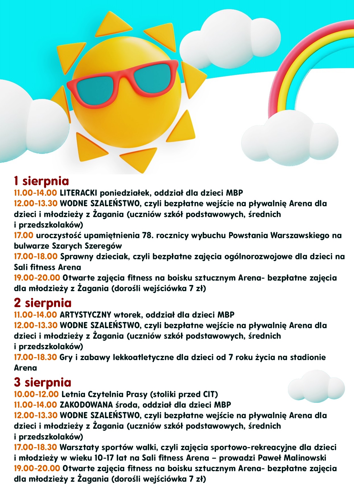 12.00-13.30 WODNE SZALEŃSTWO, czyli bezpłatne wejście na pływalnię Arena dla dzieci i młodzieży z Żagania (uczniów szkół podstawowych, średnich i przedszkolaków), limit wejść – 40 osób