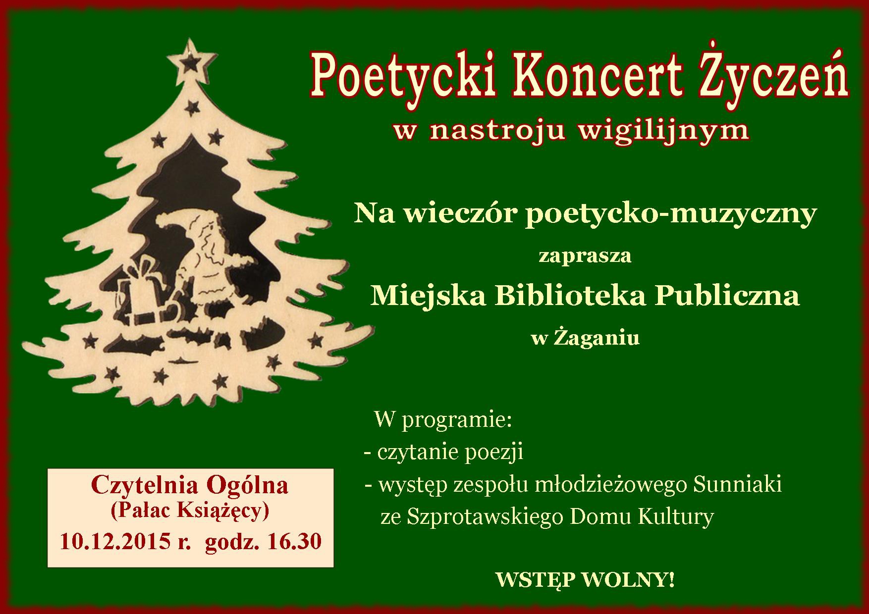 Zapraszamy na Poetycki Koncert Życzeń w nastroju wigilijnym. Koncert odbędzie się w Czytelni Ogólnej Miejskiej Biblioteki Publicznej w Żaganiu w czwartek 10 grudnia o godzinie 16:30. W programie czytanie poezji i występ zespołu młodzieżowego Sunniaki ze Szprotawskiego Domu Kultury.