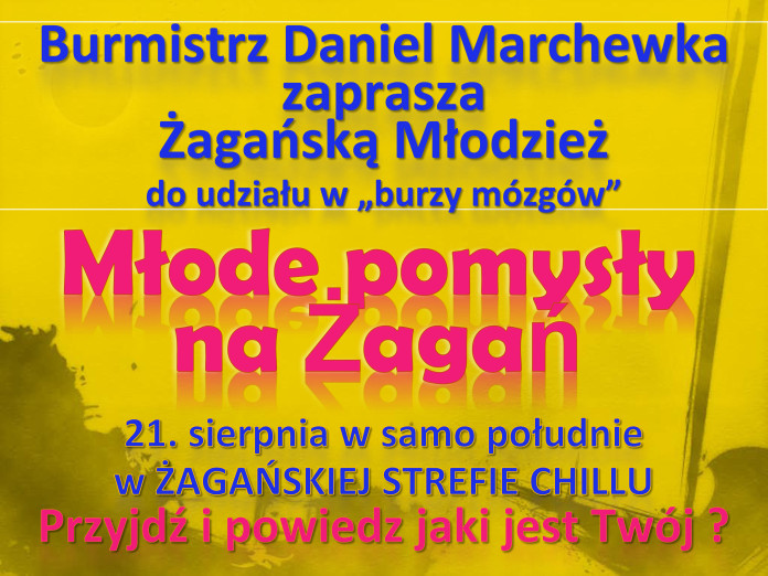 Burmistrz Daniel Marchewka zaprasza żagańską młodzież do udziału w “burzy mózgów”. Spotkanie, na którym porozmawiamy o Waszych pomysłach na Żagań odbędzie się w najbliższy piątek 21 sierpnia o godzinie 12:00 w Żagańskiej Strefie Chillu. Zapraszamy do podzielenia się swoimi pomysłami. Zmieniajmy wspólnie Żagań na dobre!