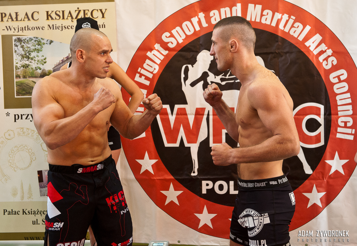 A na deser dwie walki MMA. Na ringu najlepszy polski sędzia – Piotr Michalak z Łodzi, sędziujący regularnie w KSW, a od niedawna także w UFC. I na początek walka o pas WFMC Pro MMA. Jego obrońcą był Adam Smulski z Malinowski Team.