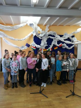 Na powitanie zebrani obejrzeli krótki program artystyczny, podczas którego uczniowie naszej szkoły zaprezentowali swoje talenty wokalne, muzyczne oraz taneczne, a szkolny chór pod opieką pana Szymona Kraszewskiego wykonał “Odę do radości” – hymn Unii Europejskiej.