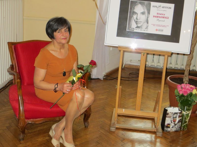 E. Pawłowicz działa w Grupie Artystycznej od 2010 roku, czyli od chwili jej powstania. Tworzy swoje portrety ze zdjęć. Nanosi na nie kratkę. Taką samą kratkę nanosi też na papier. Analizuje każdy fragment zdjęcia i żmudnie przenosi zawartość każdej kratki. Potem usuwa wszystkie linie pomocnicze. Jej postaci są żywe i pełne emocji dzięki bardzo dokładnemu odwzorowaniu oczu.