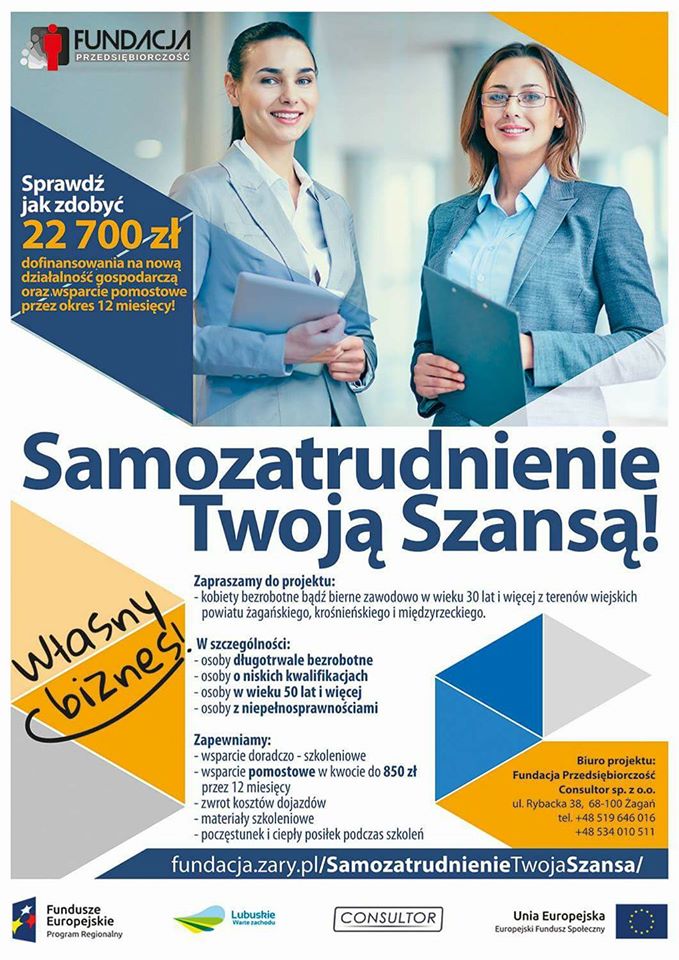 Fundacja “Przedsiębiorczość” zaprasza kobiety bezrobotne bądź bierne zawodowo do udziału w projekcie „Samozatrudnienie Twoją Szansą”. Projekt zakłada przygotowanie 30 uczestników do rozpoczęcia i prowadzenia działalności gospodarczej poprzez udział w szkoleniach, doradztwie oraz udzielenie dotacji i/lub wsparcia pomostowego dla 23 z nich. Projekt realizowany będzie w okresie od 01.01.2017 r. do 30.04.2017 r. na terenie powiatów żagańskiego, międzyrzeckiego, krośnieńskiego. W ramach projektu oferujemy bezzwrotne dotacje dla kobiet na rozpoczęcie działalności gospodarczej w wysokości 22 700 76 zł oraz wsparcie pomostowe przez okres 12 miesięcy w wysokości 851,24 zł/mc. Ponadto doradztwo zawodowe, biznesowe, szkolenia w zakresie zakładania działalności gospodarczej.