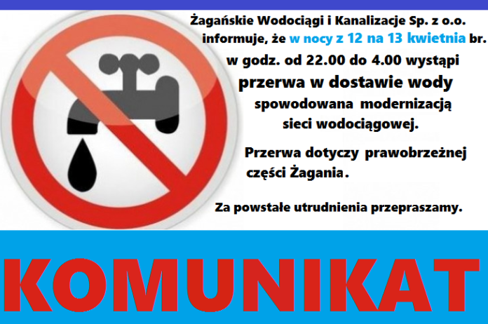 Żagańskie Wodociągi i Kanalizacje Sp. z o.o. w Żaganiu informuje, że w nocy z 12 kwietnia na 13 kwietnia 2017 roku w godzinach 22.00-4.00 wystąpi przerwa w dostawie wody spowodowana modernizacją sieci wodociągowej. Przerwa dotyczy prawobrzeżnej części Żagania.