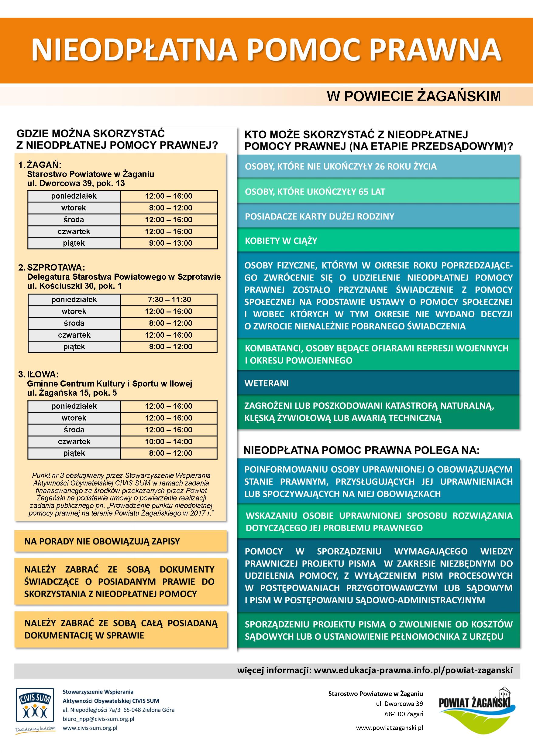 Dzięki współpracy samorządu powiatowego ze Stowarzyszeniem CIVIS SUM z Zielonej Góry przy punktach nieodpłatnej pomocy prawnej zostaną zorganizowane dodatkowe dyżury prawnika dla osób, które nie kwalifikują się do uzyskania systemowej pomocy w punktach. Oto harmonogram prowadzonych w ramach współpracy porad prawnych w roku 2017: