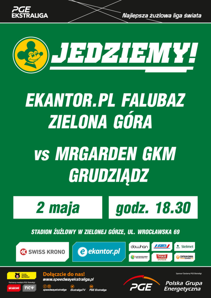 We wtorek 2 maja na stadionie w Zielonej Górze o 18.30  Ekantor.pl Falubaz zmierzy się z MRGARDEN GKM Grudziądz. Wszyscy na W69! W trzeciej rundzie PGE Ekstraligi rywalem Ekantor.pl Falubazu będzie Włókniarz Vitroszlif Crossfit Częstochowa. Mecz odbędzie się na W69 w Zielonej Górze w niedzielę 7 maja o godzinie 16.30. Bilety do kupienia na: biletynafalubaz.pl oraz w Żarach, Zielonej Górze, Krośnie Odrzańskim i w kasach stadionu w dniu meczu.