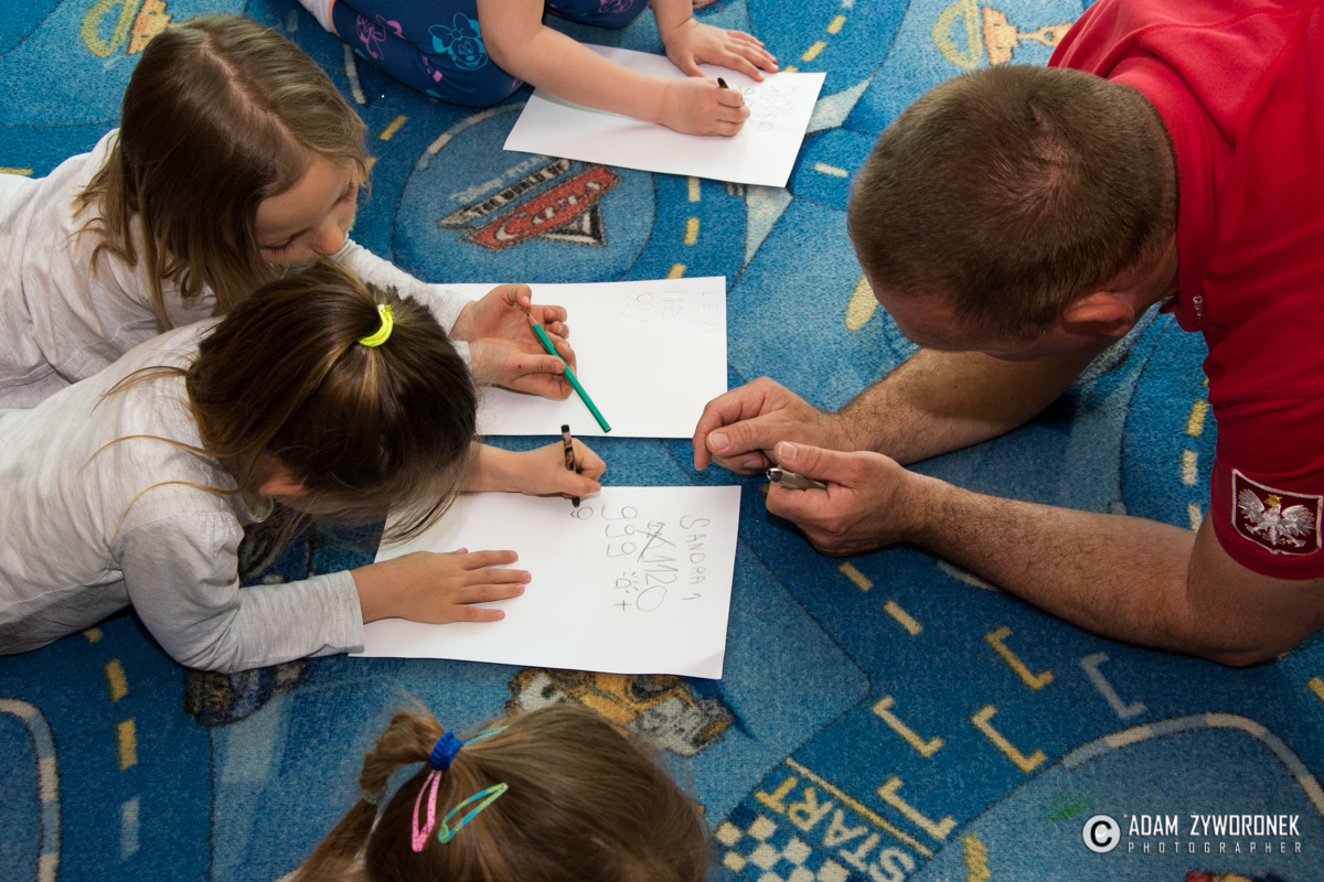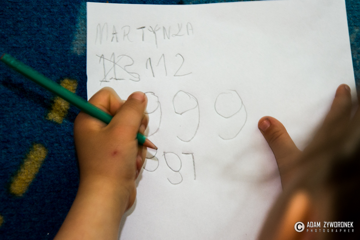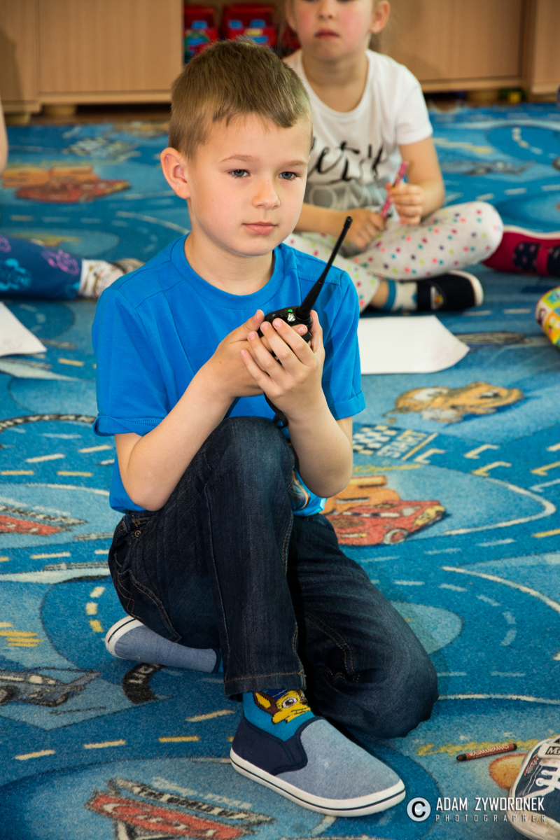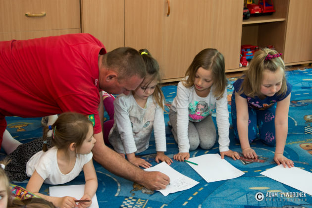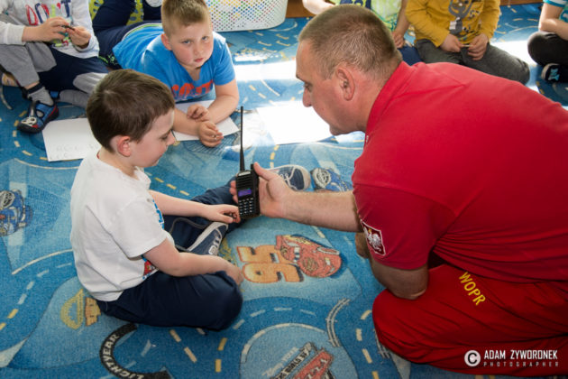 Oprócz prezesa z przedszkolakami spotkali się: Aleksander Iwaniak oraz Dominika i Wiktoria Kosiorowskie. Razem utrwalali alarmowe numery telefonów: do pogotowia, straży pożarnej i na policję. – A najważniejszy jest numer alarmowy 112 – tłumaczył K. Rębacz, który zaprosił Olka Bodaka do odegrania scenki wzywania pomocy. – Mówię jak się nazywam – wyjaśniał Olek, co i gdzie się stało. Trzeba podać ulicę i numer domu, w którym na przykład wybuchł pożar.