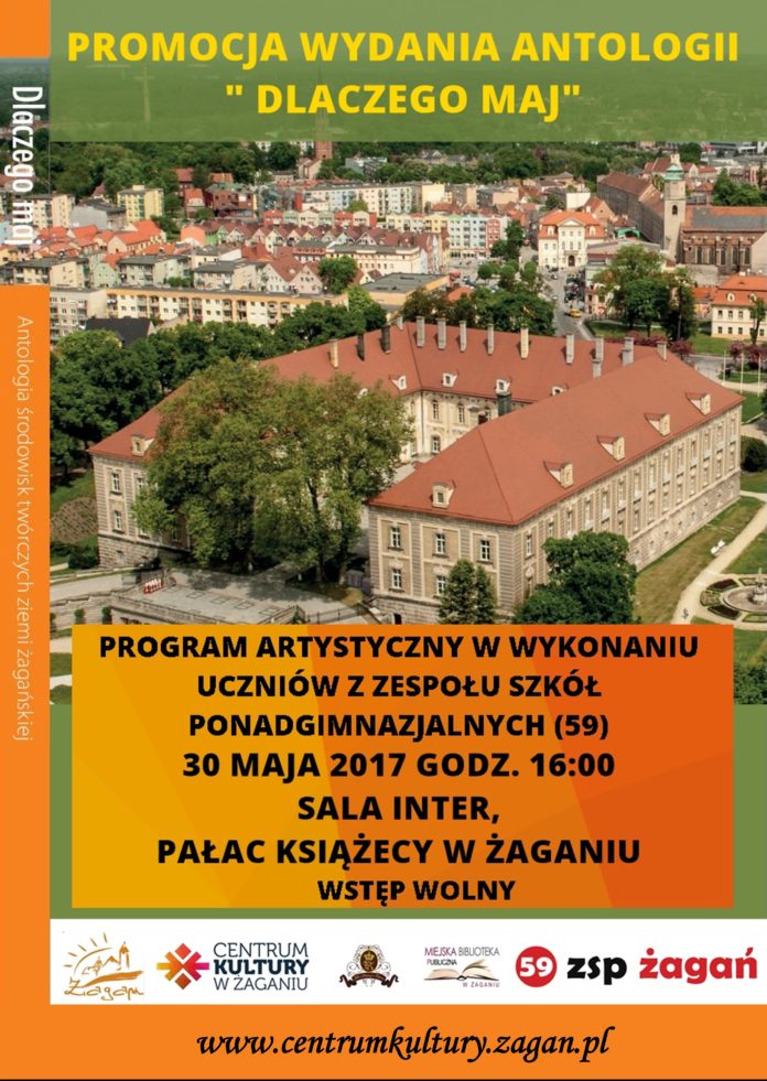 We wtorek 30 maja o godz. 16.00 w sali Inter Pałacu Książęcego odbędzie się promocja wydania antologii środowisk twórczych ziemi żagańskiej „Dlaczego Maj”. Spotkanie uświetni program artystyczny w wykonaniu uczniów z Zespołu Szkół Ponadgimnazjalnych (59). Wstęp wolny