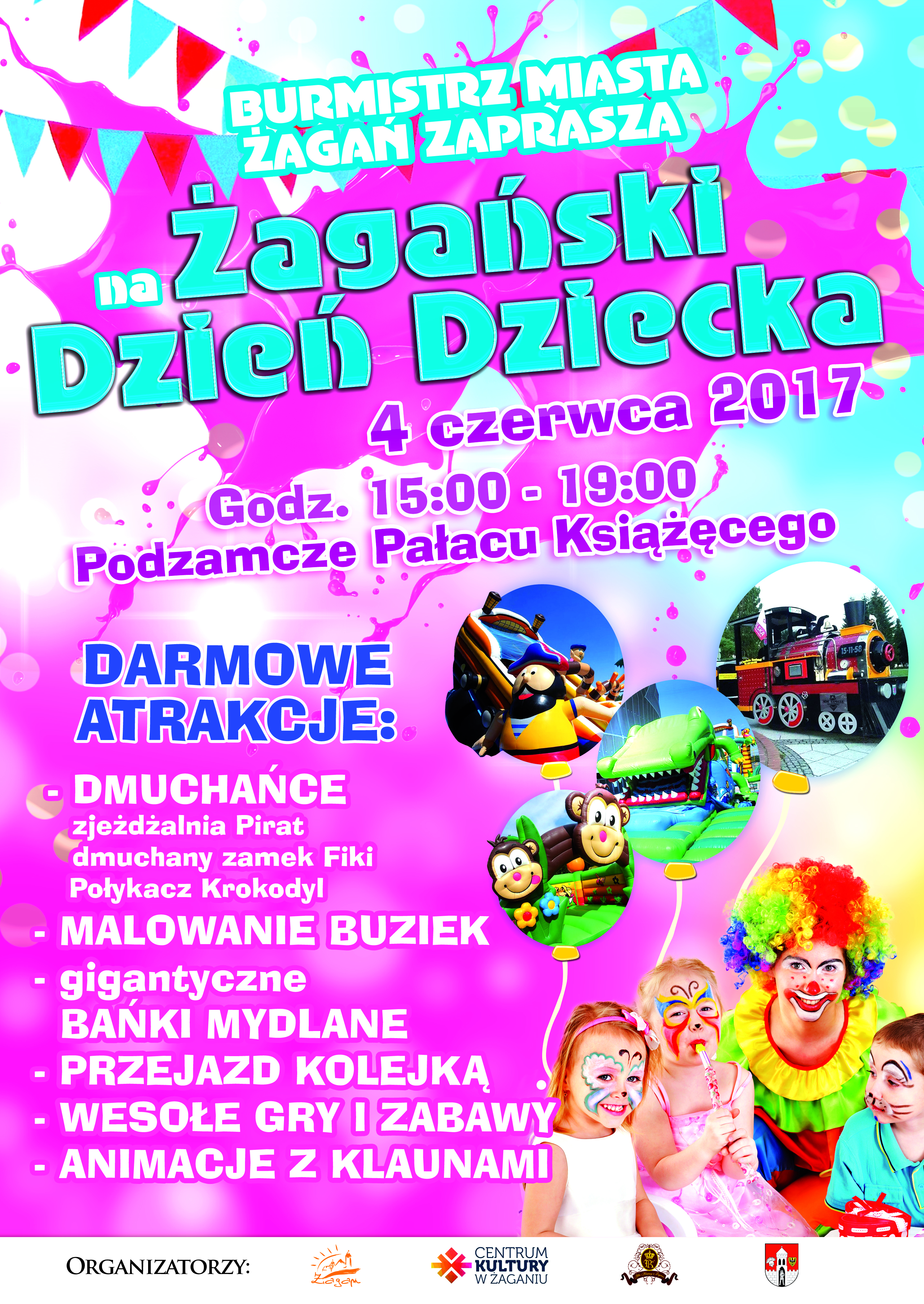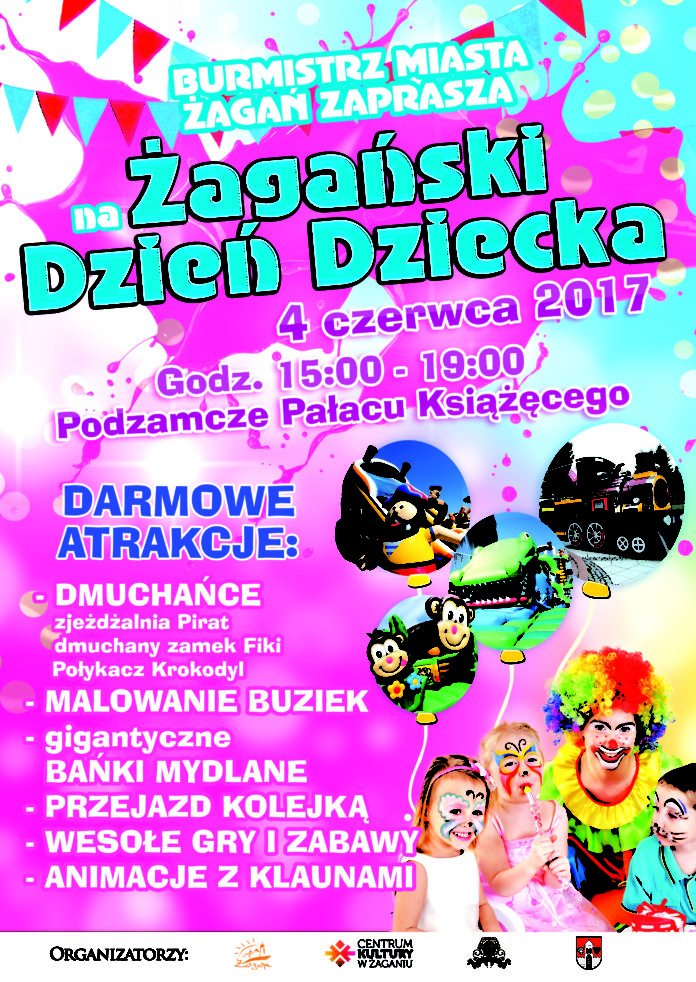 W niedzielę 4 czerwca, w godz. 15.00 – 19.00 – zapraszamy na żagański Dzień Dziecka na podzamczu Pałacu Książęcego. W programie: dmuchańce, malowanie buziek, gigantyczne bańki mydlane, przejazd kolejką, gry i zabawy, animacje z klaunami.