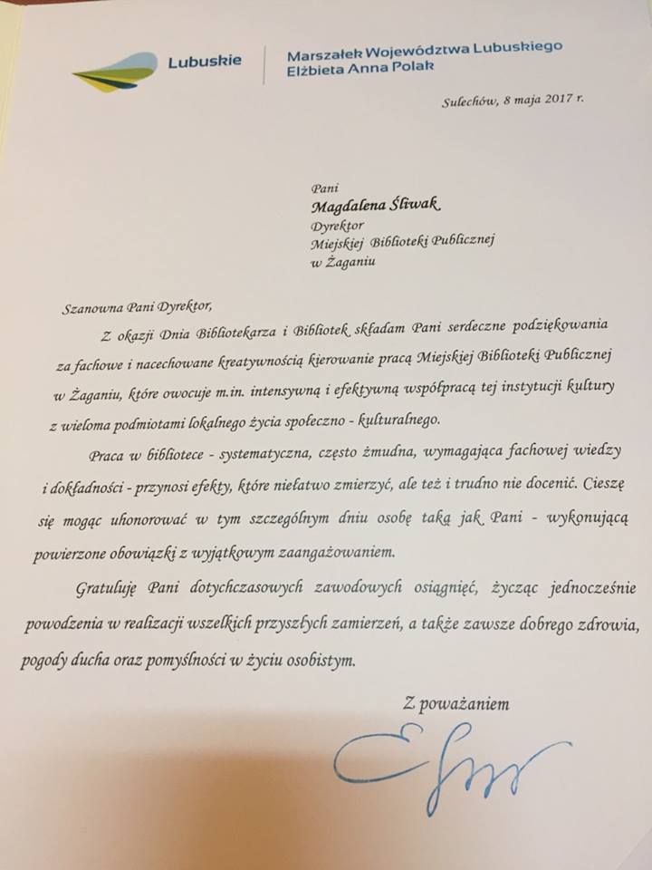Miejska Biblioteka Publiczna w Żaganiu świętuje w tym roku 70-lecie istnienia. Jest to doskonały pretekst do rozmowy o zmianach, teraźniejszości i przyszłości jednego z najważniejszych ośrodków kultury w mieście. 8 maja 2017 roku dyrektor placówki, pani Magdalena Śliwak, z okazji Dnia Bibliotekarza i Bibliotek otrzymała podziękowania od Marszałek Województwa Lubuskiego Elżbiety Polak, która wyróżniła zaangażowanie placówki i współpracę instytucji z wieloma podmiotami lokalnego życia społeczno-kulturalnego. Za ową aktywność i codzienną troskę o czytelnictwo w mieście serdecznie dziękujemy!