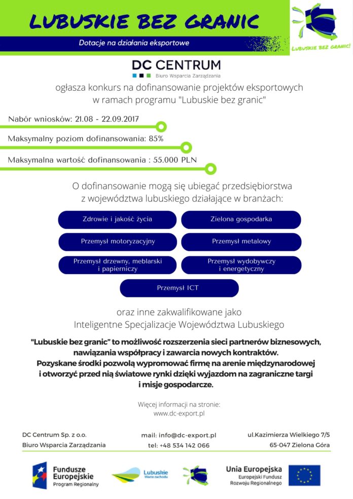 DC Centrum Biuro wsparcia Zarządzania sp. z o.o. ogłasza konkurs na dofinansowanie projektów eksportowych w ramach programu „Lubuskie bez granic”.