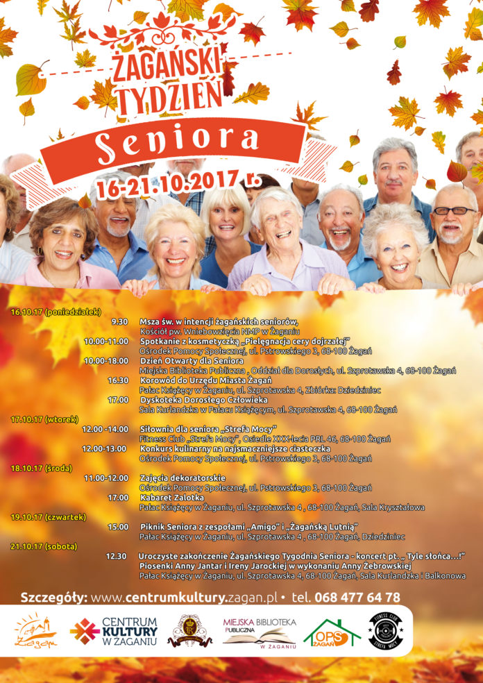 12.30 Uroczyste zakończenie Żagańskiego Tygodnia Seniora – koncert pt. „ Tyle słońca…!” Piosenki Anny Jantar i Ireny Jarockiej w wykonaniu Anny Żebrowskiej w sali Kurlandzkiej i Balkonowej Pałacu Książęcego.