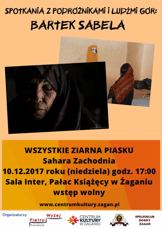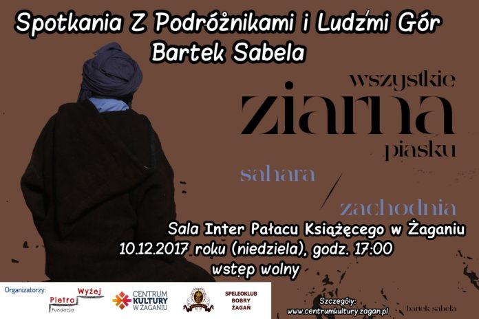W niedzielę 10 grudnia o godz. 17.00 zapraszamy na pokaz slajdów: „Wszystkie ziarna piasku. Sahara Zachodnia” autorstwa Bartka Sabeli. Pokaz odbędzie się w ramach cyklicznych spotkań „Spotkania z Podróżnikami i Ludźmi Gór”. Sala Inter, Pałac Książęcy w Żaganiu – wstęp wolny.
