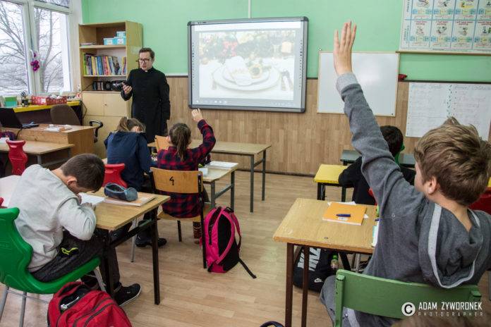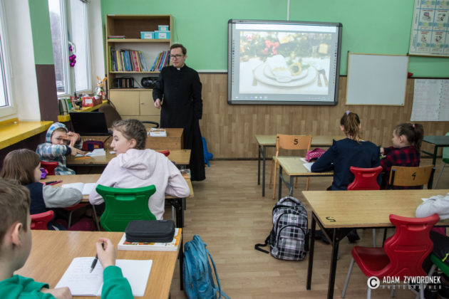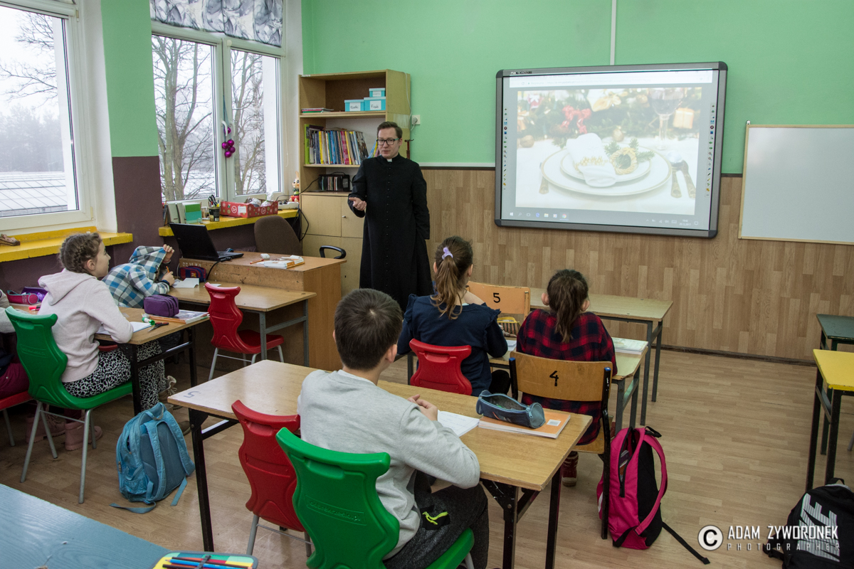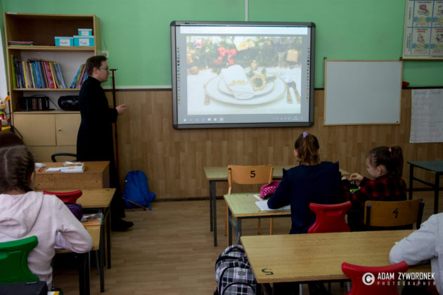 Każda z placówek ma przynajmniej jedną tablicę. Korzystają z nich nauczyciele różnych specjalności. Również księża podczas zajęć z religii. W Publicznej Szkole Podstawowej nr 4 na osiedlu Kolonia Laski jest narzędziem pracy dla księdza Jędrzeja Polaka. Na zdjęciu lekcja o tradycjach wigilijnych. Uczniowie mówią, że takie zajęcia są dużo ciekawsze od tych z tradycyjną tablicą i kredą.