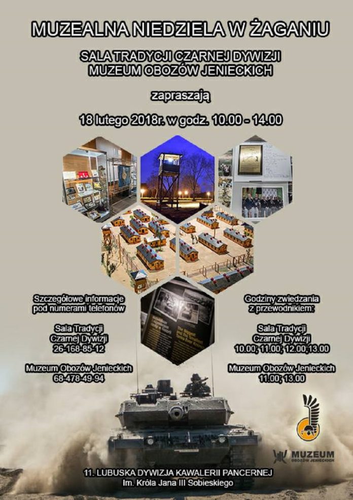 W każdą trzecią niedzielę miesiąca kustosz Waldemar Kotula, kustosz Sali Tradycji „Czarnej Dywizji” wraz z Markiem Łazarzem, dyrektorem Muzeum Obozów Jenieckich w Żaganiu zapraszają na bezpłatne zwiedzanie placówek. – Zaczynamy już w najbliższą niedzielę 18 lutego – zachęcają. – Zapraszamy na bezpłatne wycieczki z przewodnikiem w muzeum o godz. 11.00 i 13.00 oraz zwiedzanie Sali Tradycji z przewodnikiem: o 10.00, 11.00, 12.00 i 13.00.