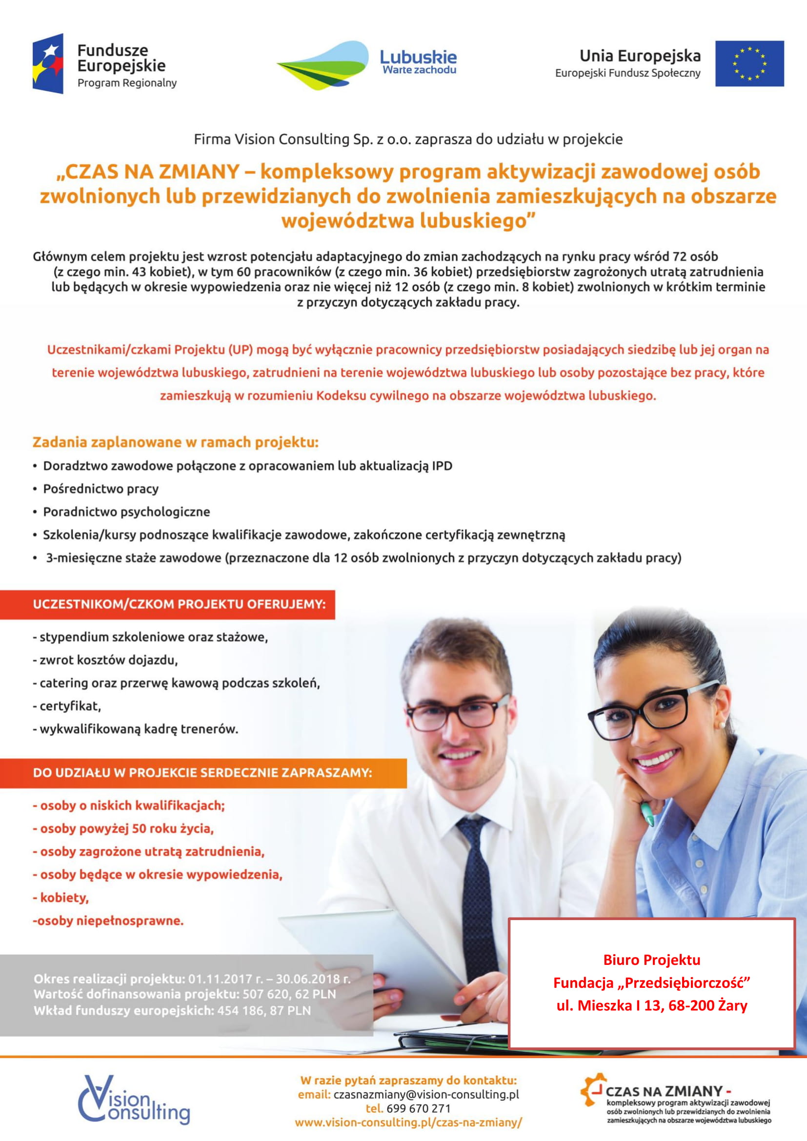 Uczestnikami projektu mogą być wyłącznie pracownicy przedsiębiorstw posiadających siedzibę lub jej organ na terenie woj. lubuskiego, zatrudnieni na terenie woj. lubuskiego lub osoby pozostające bez pracy, które zamieszkują w rozumieniu KC na obszarze woj. lubuskiego.