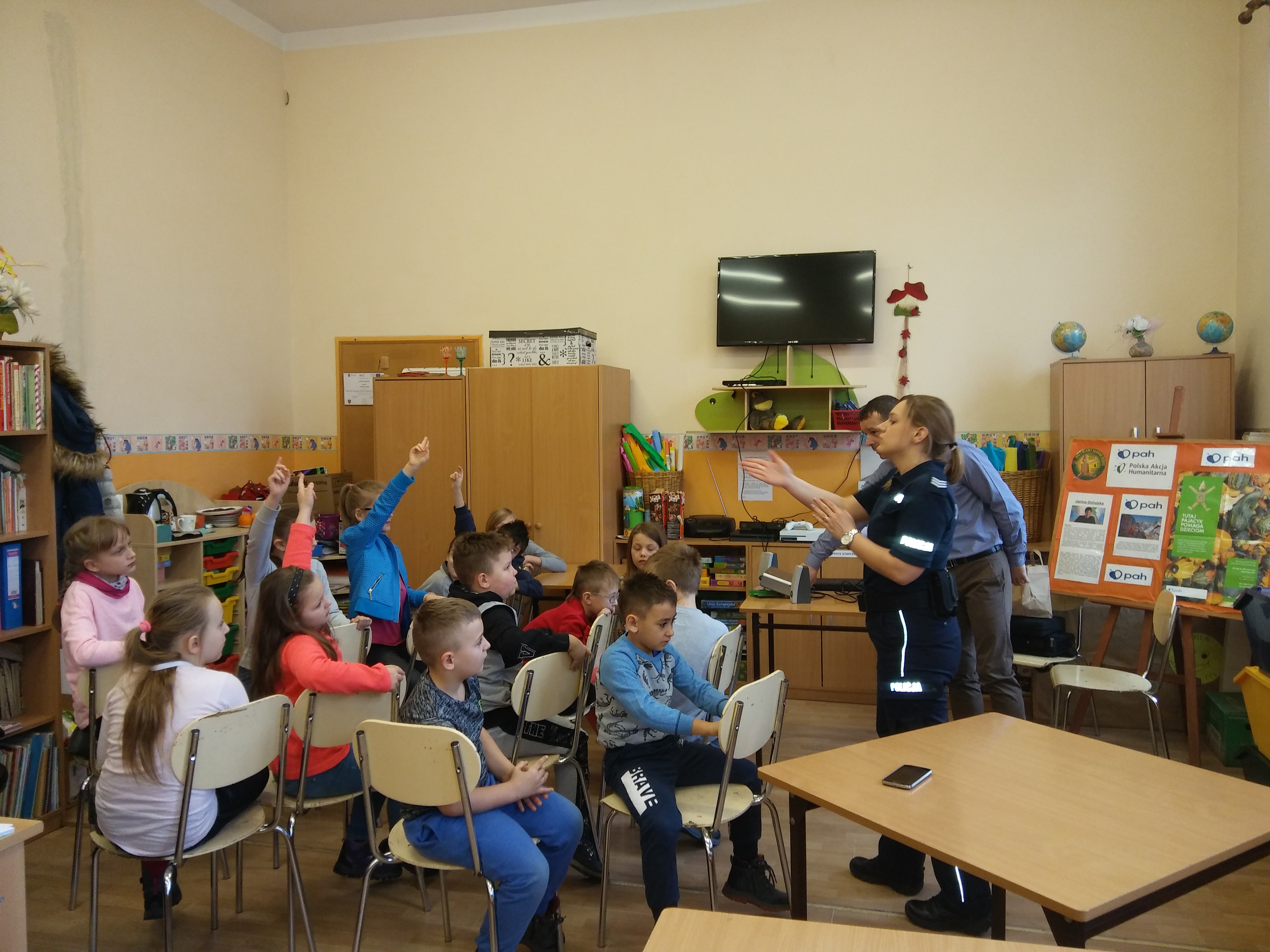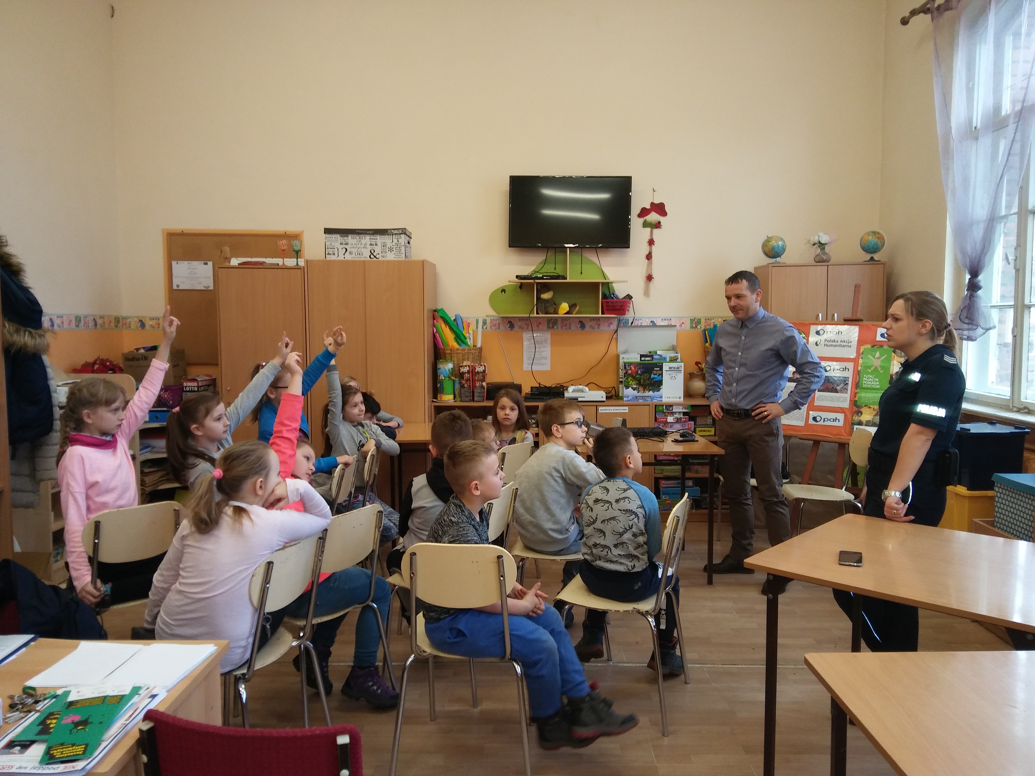 Dzieci przebywające na półkolonii w Publicznej Szkole Podstawowej nr 2 w Żaganiu odwiedził w piątek 16 lutego przedstawiciel Urzędu Miasta Żagań. Piotr Puchalski oraz Monika Broda z KPP Żagań.