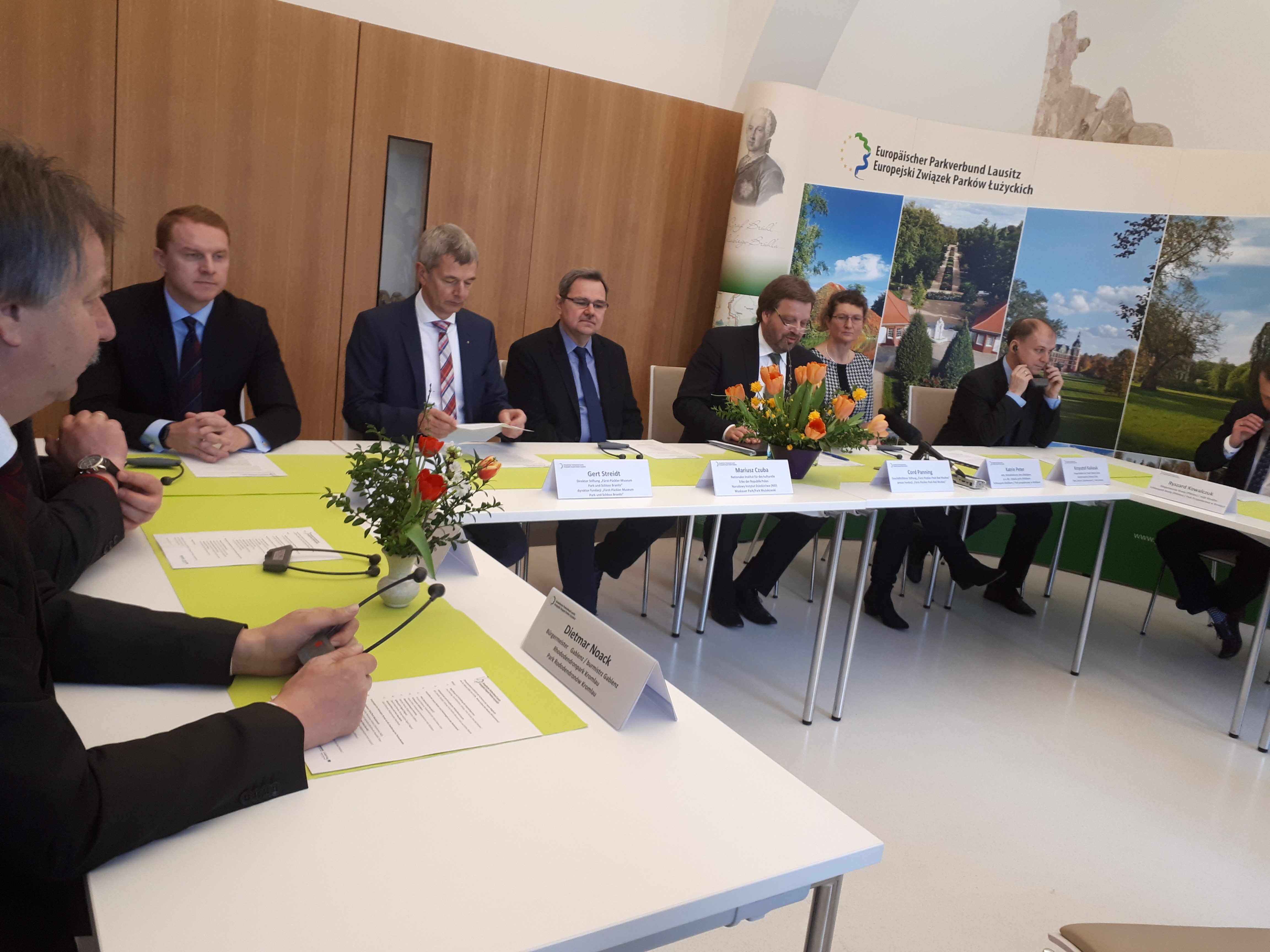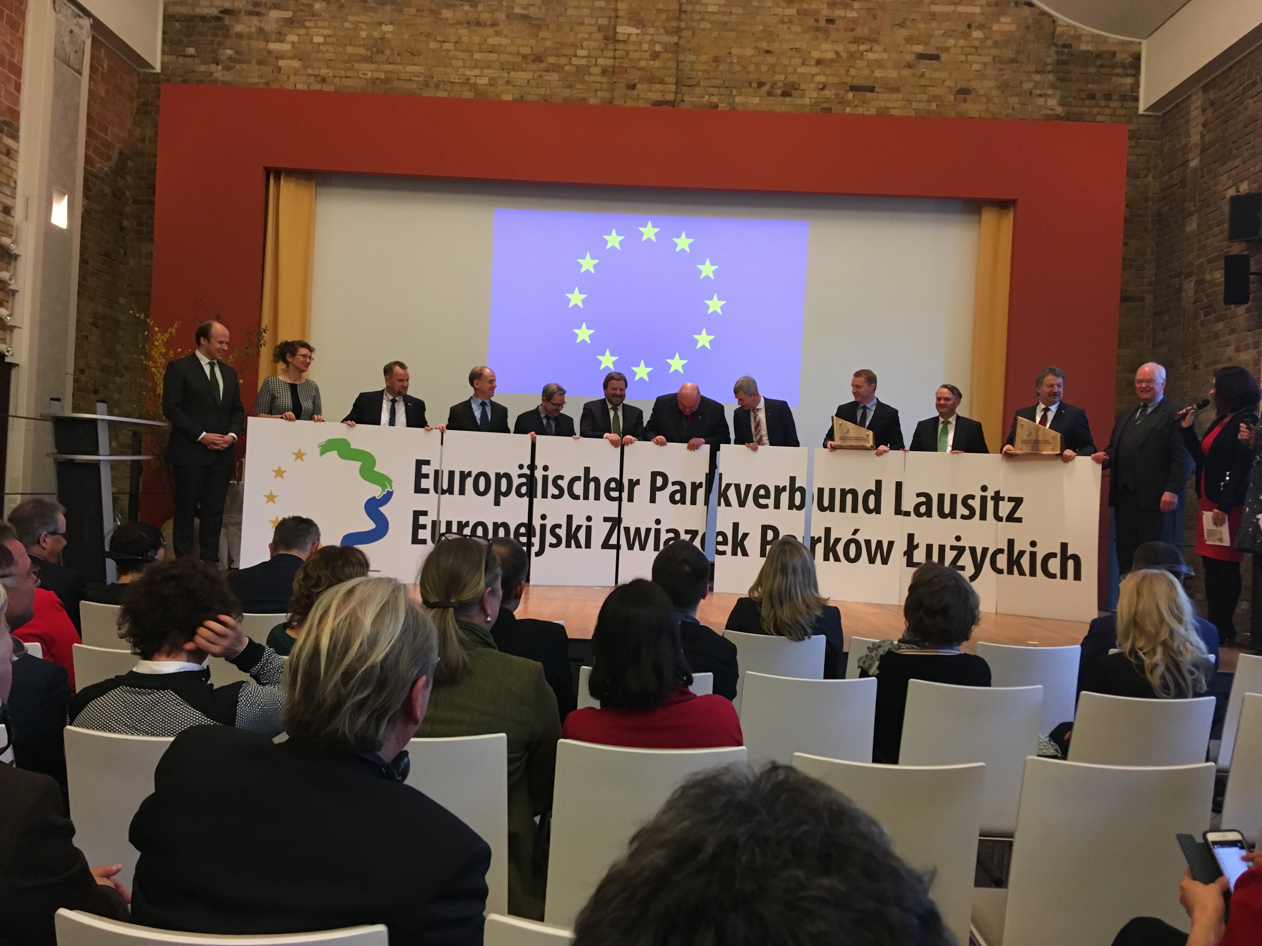 Moment podpisania aktu o współpracy został przeprowadzony bardzo spektakularnie. Na scenę zaproszono dotychczasowych członków i każdy z nich ustawiał się w określonym porządku otrzymując tablice przedstawiające poszczególne parki. Następnie zapraszano na scenę każdego nowo przyjmowanego przedstawiciela parku, który po podpisaniu dokumentu zajmował określone miejsce wśród pozostałych osób. Na zakończenie, każdy przedstawiciel odwrócił zdjęcie swojego parku, a na tablicach widowni ukazało się charakterystyczne logo Europejskiego Związku Parków Łużyckich.