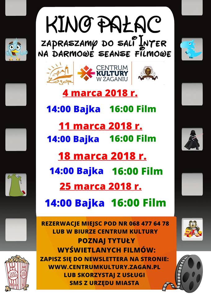 Zapisz się do newslettera na stronie Centrum Kultury lub usługi „Sms z Urzędu Miasta” i bądź na bieżąco z informacjami odnośnie darmowych seansów w „Kinie Pałac”, w sali Inter Pałacu Książęcego. Zapraszamy w każdą marcową niedzielę (4.03,11.03,18.03, 25.03). O godz. 14:00 projekcja bajki dla najmłodszych, natomiast o godz. 16:00 seans filmowy. Rezerwacje pod nr tel. 068 477 64 78 lub w biurze Centrum Kultury (Dział Imprez pok. 164, Pałac).