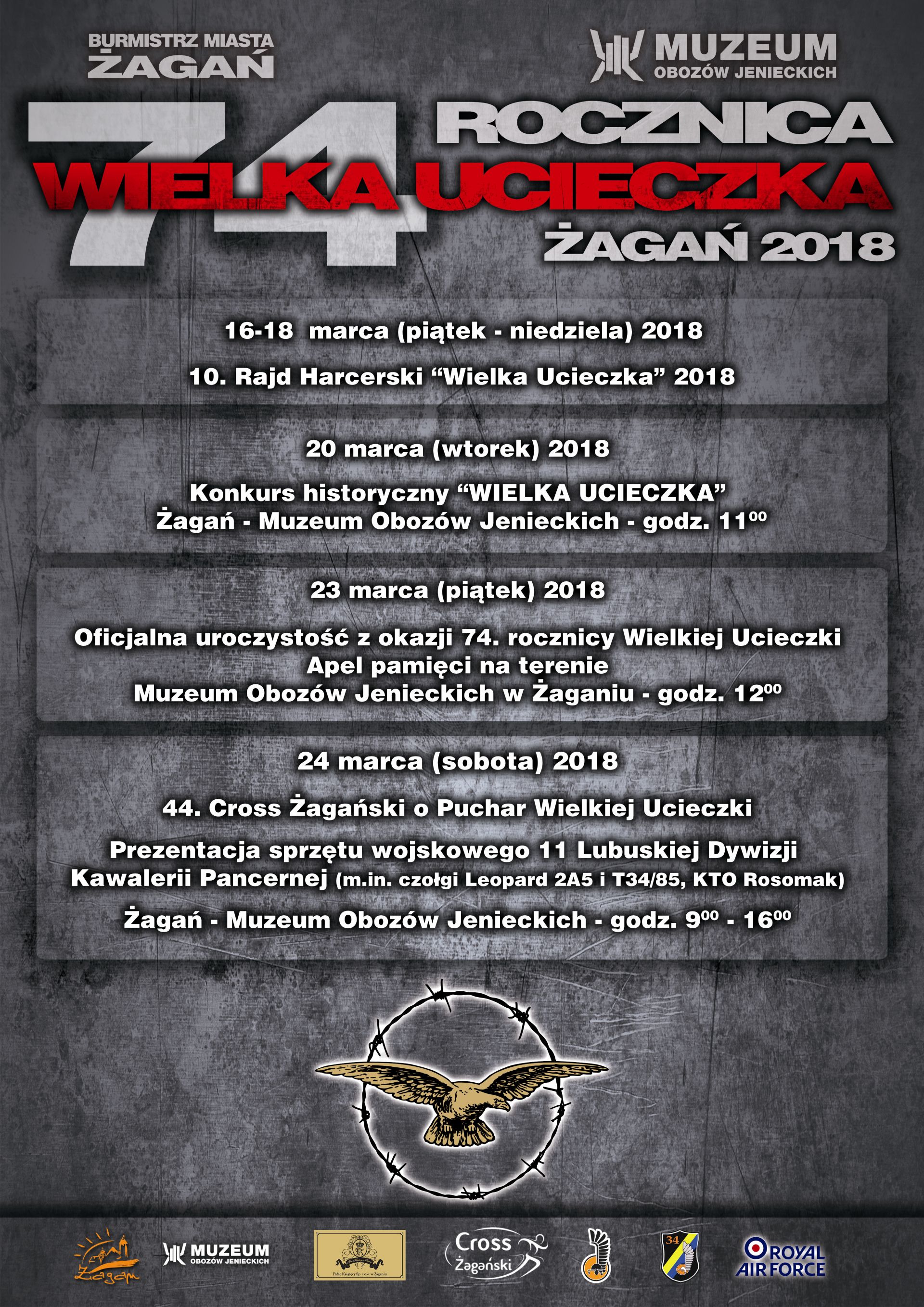 Za kilka dni ruszają obchody 74. Rocznicy Wielkiej Ucieczki. Zaczynamy już w najbliższy piątek (16 marca) X. jubileuszowym Rajdem Harcerskim Wielka Ucieczka. We wtorek 20 marca w baraku 104 odbędzie się konkurs wiedzy o Wielkiej Ucieczce. W piątek 23 marca od 12.00 uroczystości pod pomnikiem na Stalagu, zaś w sobotę 24 marca warto przyjść na pokaz sprzętu wojskowego i Żagański Cross.