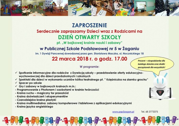Publiczna Szkoła Podstawowa nr 5 w Żaganiu zaprasza w czwartek 22 marca o godz. 17.00 na dzień otwarty pod hasłem “W bajkowej krainie nauki i zabawy”. W programie między innymi spektakl “Księżniczka na ziarnku grochu”, gry, zabawy, zwiedzanie szkoły, itp.
