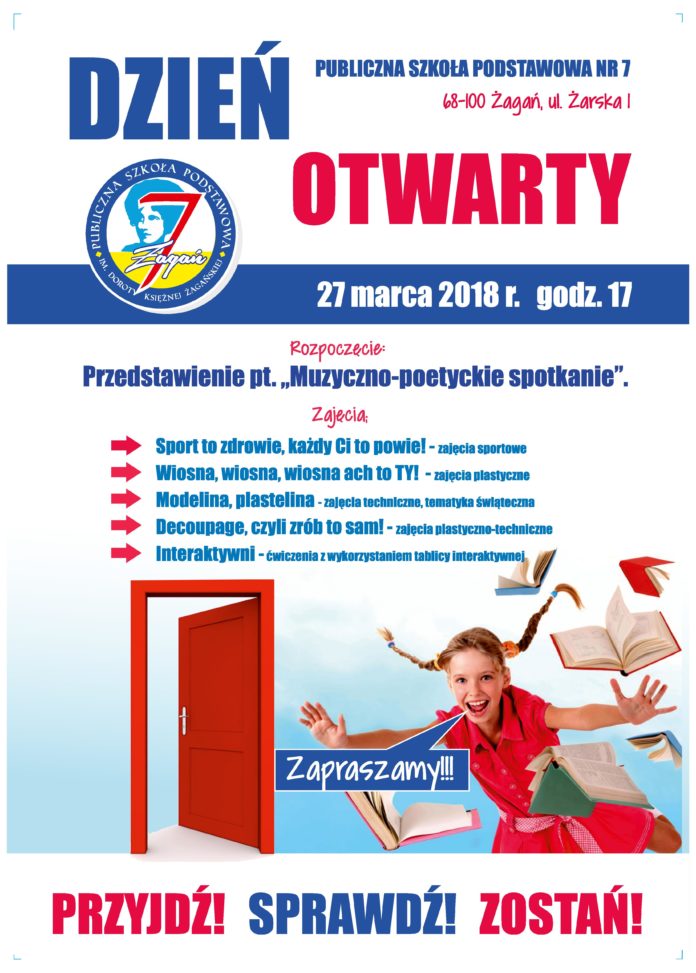 Żagańska “Siódemka” przy ul. Żarskiej 1 zaprasza na dzień otwarty w piątek 27 marca, od godz. 17.00. W programie między innymi przedstawienie pod tytułem “Muzyczno-poetyckie spotkanie”, zajęcia sportowe, techniczne, z udziałem tablicy interaktywnej. Społeczność szkolna serdecznie zaprasza przyszłych uczniów.