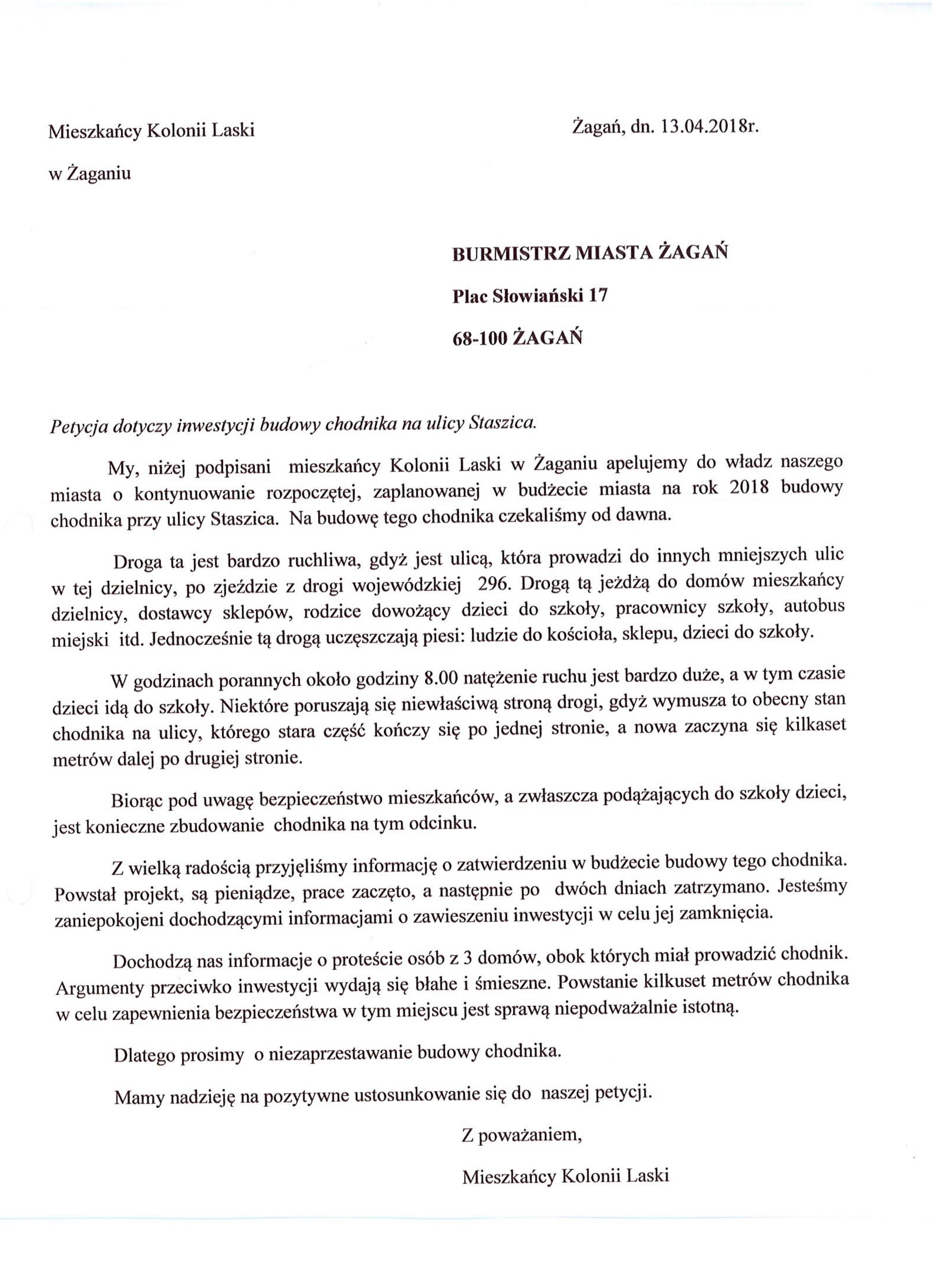 60 osób podpisało się pod petycją do władz miasta o kontynuowanie budowy chodnika przy ul. Staszica. Prace zostały przerwane po proteście złożonym przez cztery osoby, które nie chcą, żeby trakt pieszy przebiegał koło ich domów.