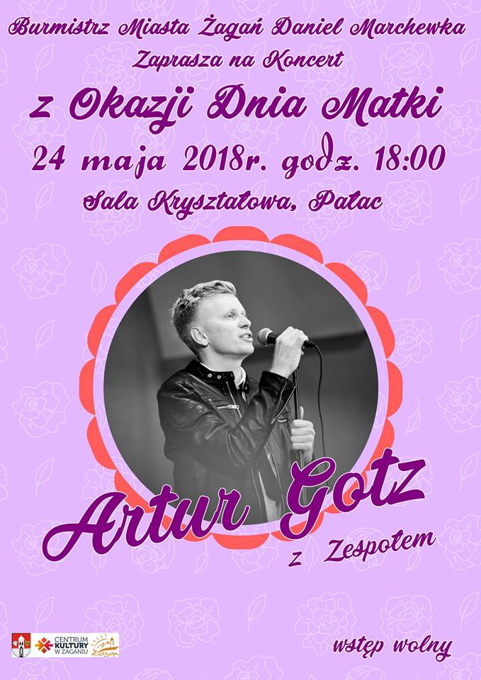 Z okazji Dnia Matki w imieniu Burmistrza Miasta Żagań Daniela Marchewki zapraszamy Państwa na koncert. w czwartek 24 maja o godz. 18.00 na scenie sali Kryształowej wystąpi aktor i wokalista młodego pokolenia Artur Gotz z zespołem muzycznym w składzie: Dawid Ludkiewicz – instrumenty klawiszowe i Andrzej Jerzykowski – gitara basowa