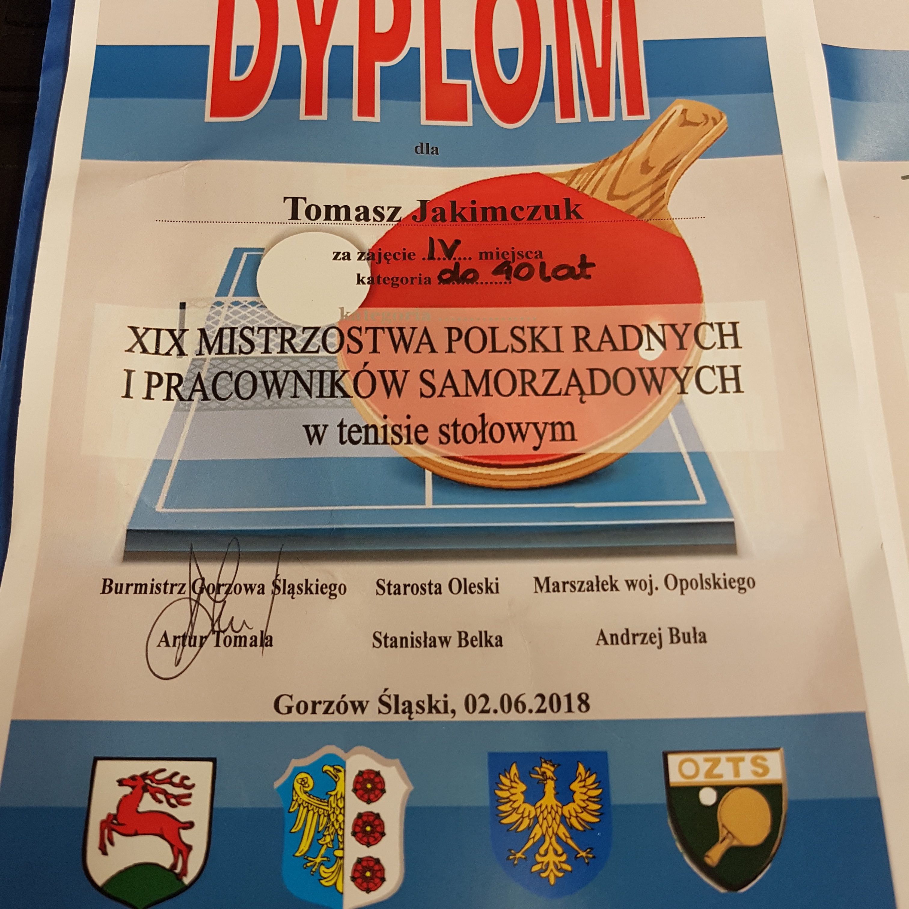 Kolejny wyjazd i kolejny sukces. Nasz kolega Tomasz Jakimczuk udał się 2 czerwca 2018 roku do Gorzowa Śląskiego. Wziął tam udział w XIX Mistrzostwach Polski Radnych i Pracowników Samorządowych w Tenisie Stołowym, zajmując IV miejsce w kategorii do 40 lat. Serdecznie gratulujemy i czekamy na więcej!
