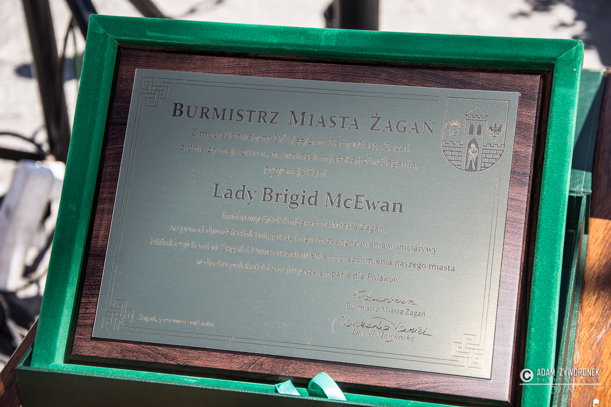 Lady Brigid McEwan odebrała tytuł z rąk burmistrza Daniela Marchewki i Wandy Winczaruk, przewodniczącej Rady Miasta Żagań.
