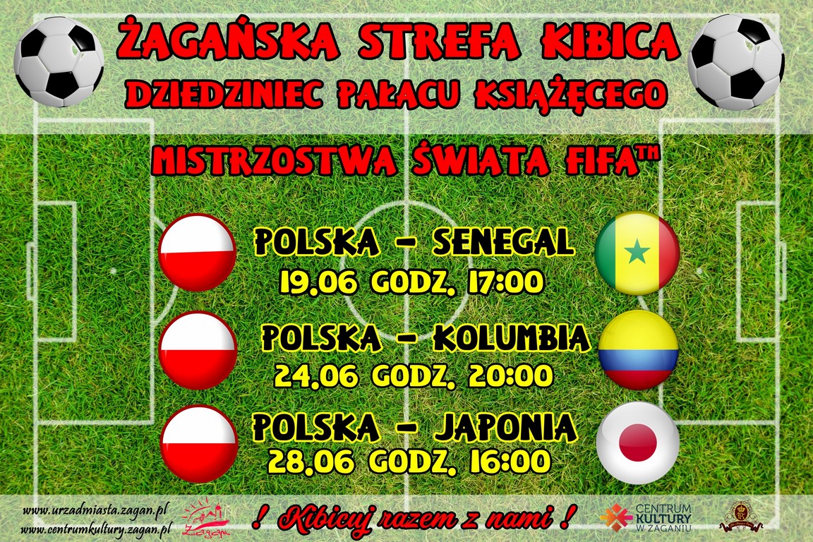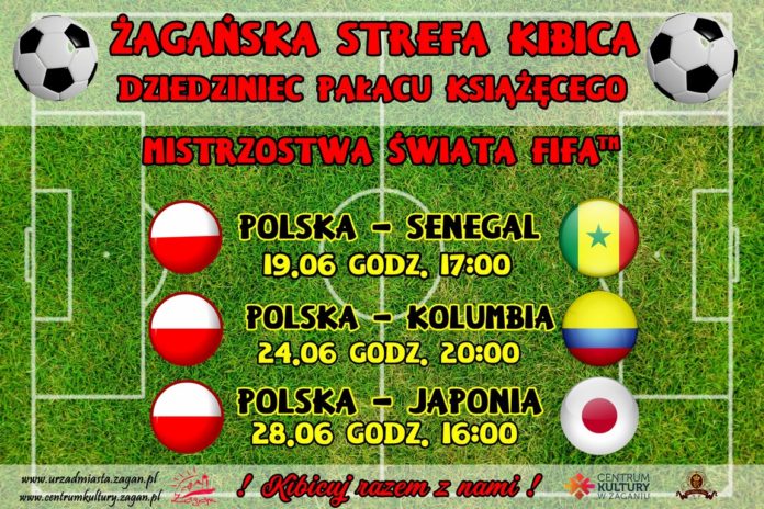 Przeżyjmy wspólnie sportowe emocje i oglądajmy razem mecze z udziałem reprezentacji Polski podczas Mistrzostw Świata w Piłce Nożnej w Rosji. Spotykamy się na dziedzińcu Pałacu Książęcego w Żaganiu. Transmisje meczów z udziałem reprezentacji Polski obejrzymy na ekranie LED – 65 cali. We wtorek 19 czerwca, o godz. 17.00: Polska – Senegal, niedziela 24 czerwca, godz.20.00: Polska – Kolumbia, czwartek 28 czerwca, godz.16.00: Polska – Japonia.